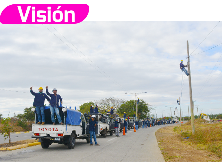 Somos la empresa líder en el sector eléctrico y de telecomunicaciones a nivel nacional y regional, de servicio público y de interés social, innovadora, cumpliendo con estándares de calidad mundial, a través de la actualización tecnológica, excelencia en los Talentos Humanos y respeto a la Madre Tierra.